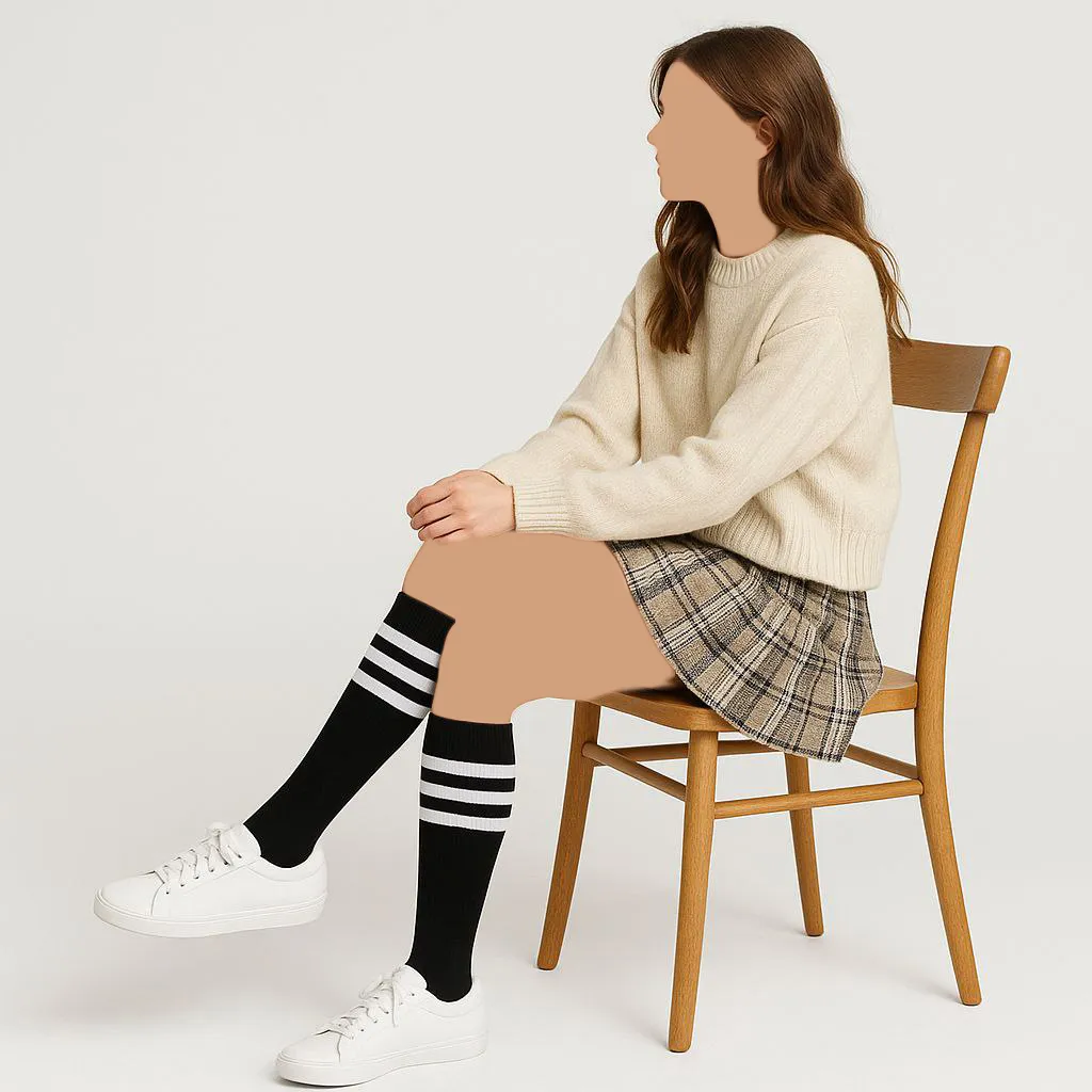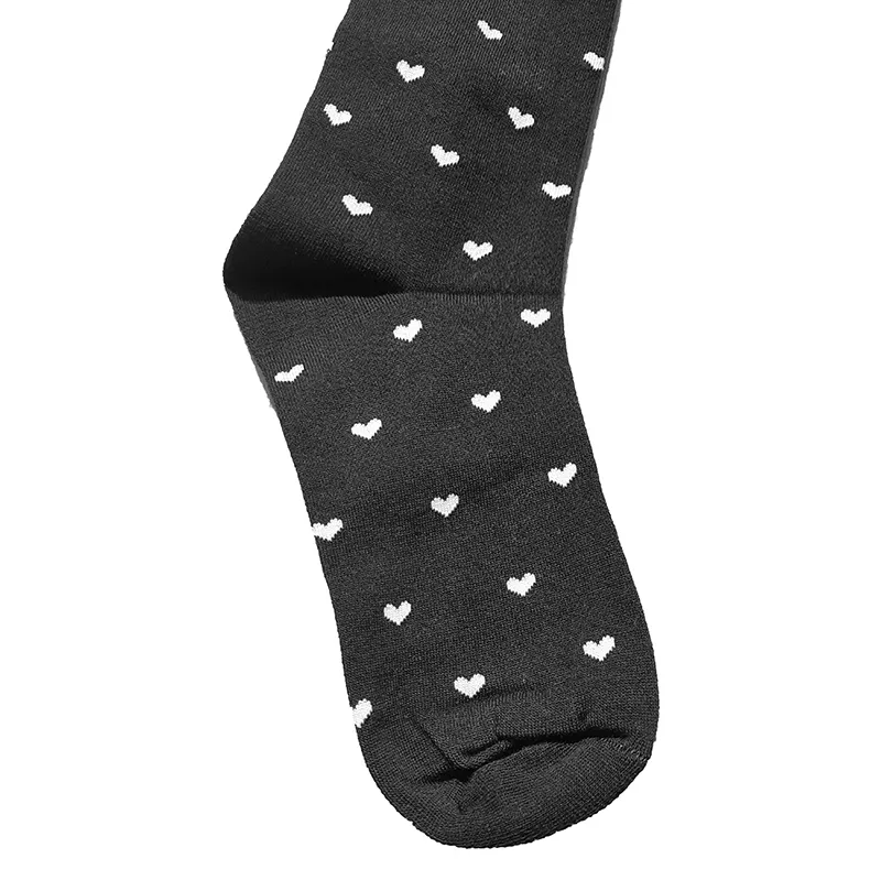 این جوراب با پوشش تا زیر زانو، تمرکز ویژهای بر زیبایی پاها دارد. خطوط سفید یا قلبهای ریز، نگاه را به سمت ساق پا هدایت میکنند و ظرافت و جذابیت بیشتری به فرم پاها میبخشند.