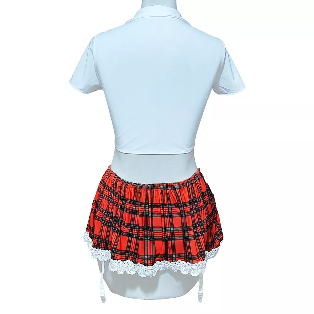 🎨 رنگ سفید در نیمتنه و جورابها نماد پاکی و معصومیت است، در حالی که رنگ قرمز و مشکی در دامن، شور و هیجان را به لباس اضافه میکنند. ترکیب این رنگها باعث میشود این لباس همزمان معصوم و جذاب به نظر برسد.
