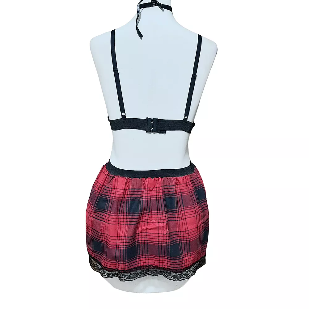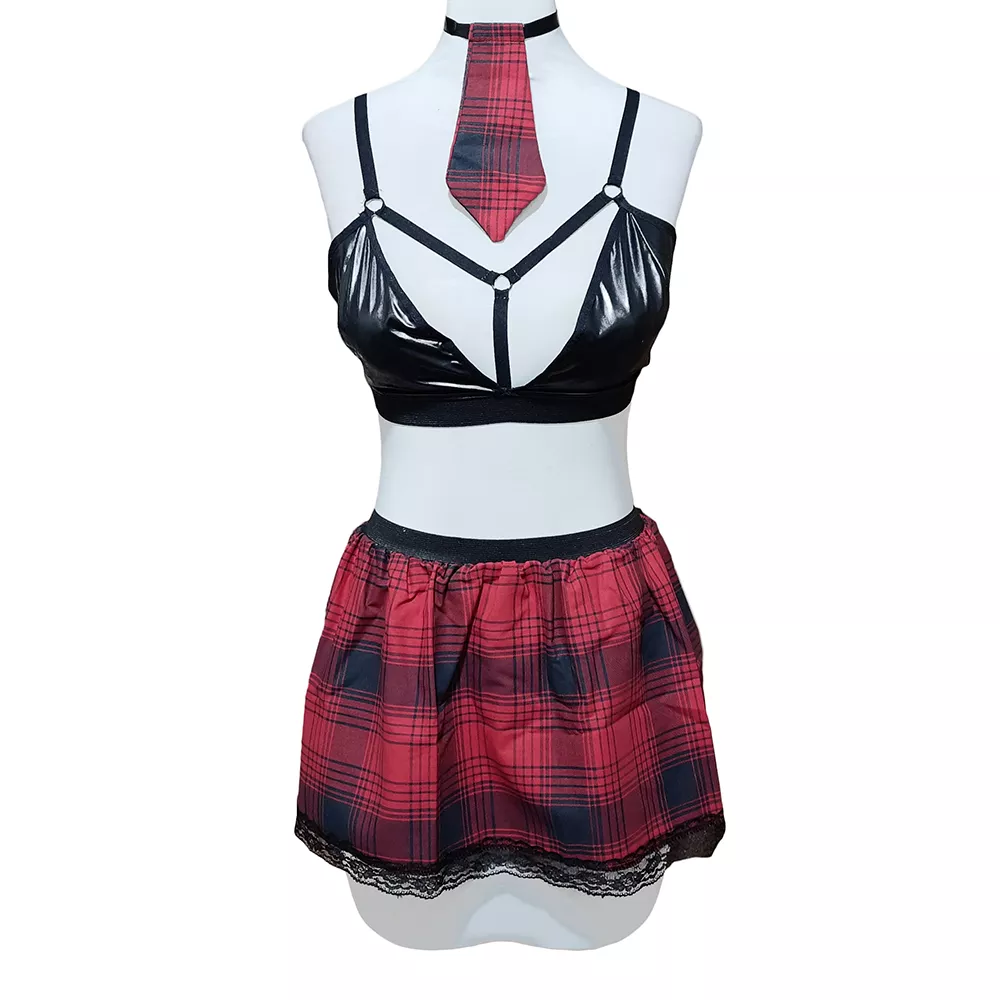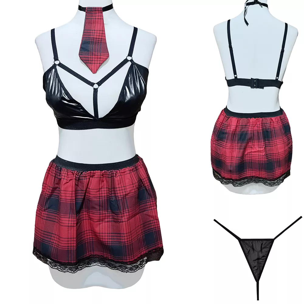 - شامل ۴ تکه کامل: کراوات، سوتین واکسی هارنسدار، دامن چهارخانه، لامبادا
