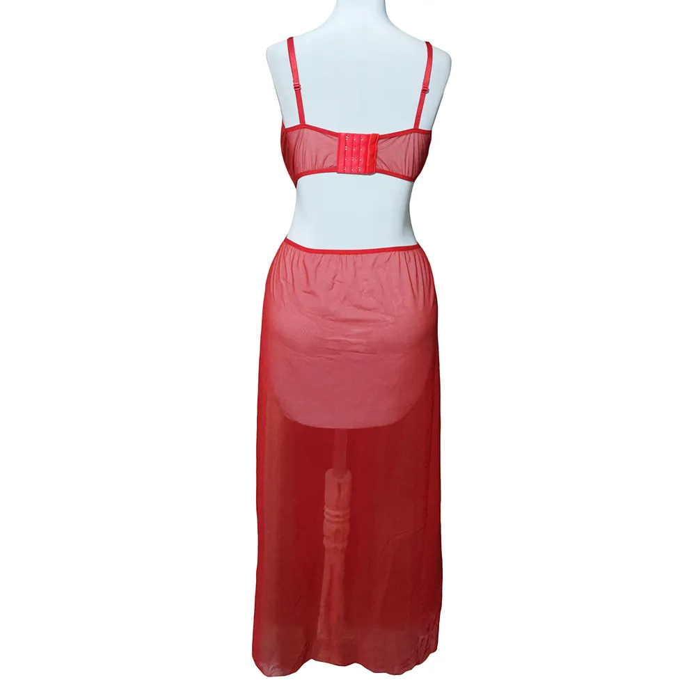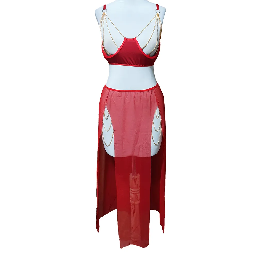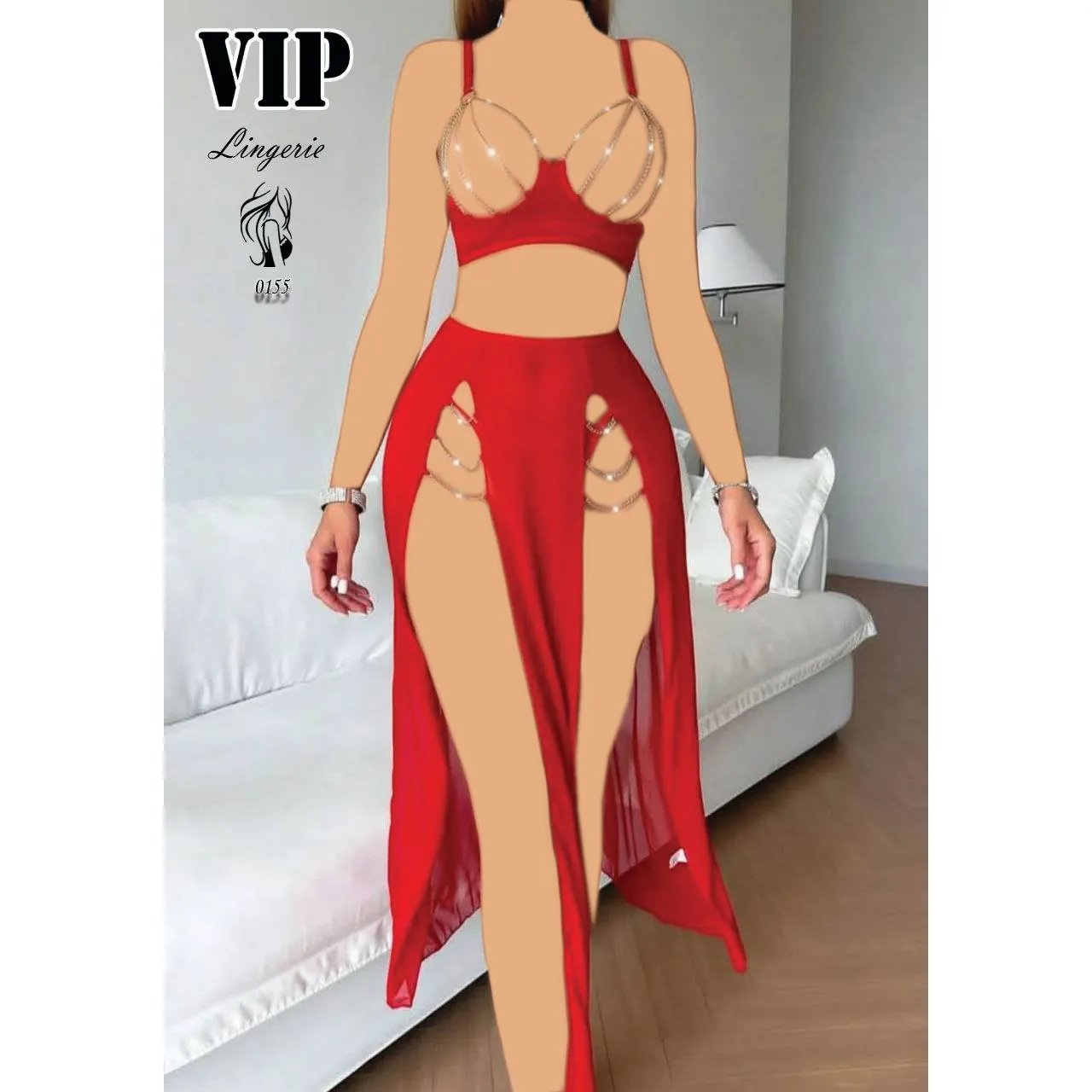 نوع ست ۳ تکه (سوتین، دامن بلند چاکدار، شورت) سایزبندی فری سایز (مناسب برای ۳۸ تا ۴۲) جنس پارچه ترکیب تور لطیف (مش) و زنجیرهای تزیینی رنگ قرمز (مناسب تمام طیفهای پوستی) ویژگی دامن بلند، بدننما با چاکهای متصل به زنجیر 💎 پیشنهاد ست کردن: